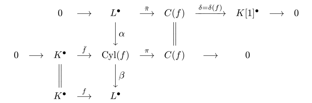 $$ 0\to K^\bullet \xrightarrow{\overline{f}} Cyl(f) \xrightarrow{\pi} C(f) \xrightarrow{\delta} K[1]^\bullet.$$