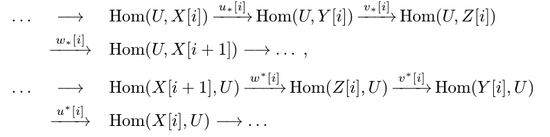 $$H(X[i]) \xrightarrow{H(u[i])} H(Y[i]) \xrightarrow{H(v[i]) } H(Z[i]) \xrightarrow{w[i]} H(X[i+1])$$ 在 $\calA$ 中是正合的。