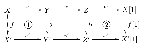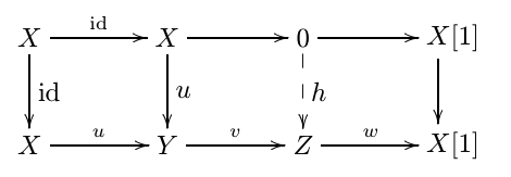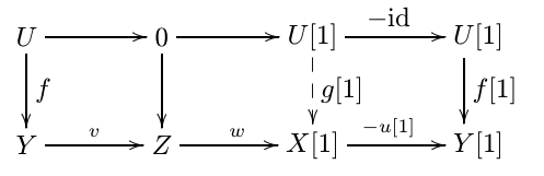 (a) 加性自态射 $T: \calD \to \calD$, 称为转移函子。我们记 $X[n]:=T^n(X), f[n]: = T^n(f)$. 三角定义为以下一组对象和态射 $$ X \xrightarrow{u} Y \xrightarrow{v} Z \xrightarrow{w} X[1]. $$ 不要求其为复形。三角之间的态射定义为使下图交换的 $(f,g,h,f[1])$