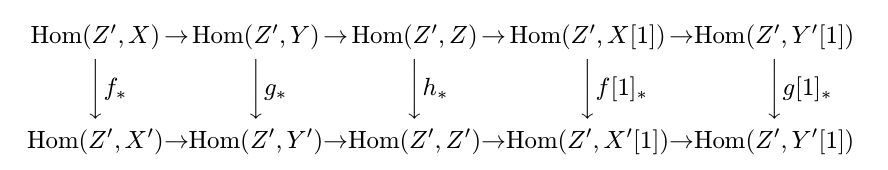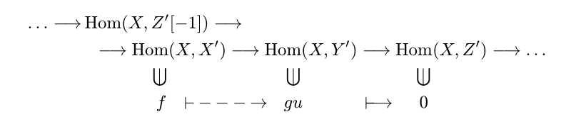 如果 $\Hom(X,Z'[-1]) = 0$, 那么 $\Hom(X,X’ ) \xrightarrow{u’_*} \Hom(X,Y’)$ 就是一个单射。所以 $f$ 是唯一的。