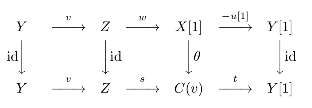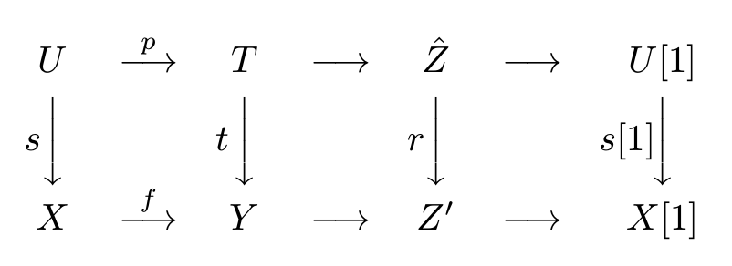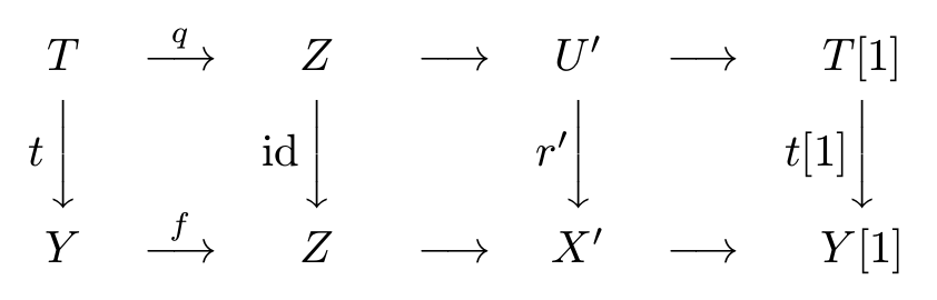 讲 $X” \xrightarrow{u”} Y”$ 补全成 $X ” \xrightarrow{u”} Y” \xrightarrow{v”}Z” \xrightarrow{w”} X”[1]$.