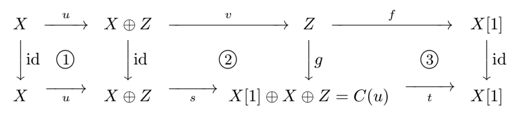 我们得到一个三角 $$X \xrightarrow{u} X \oplus Z \xrightarrow{v} Z \xrightarrow{f} X[1].$$
