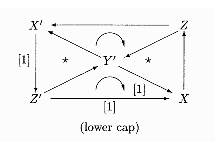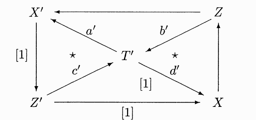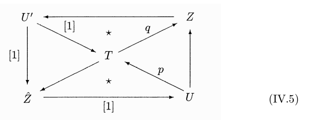 并且满足条件 $$ Y \to Z \to Y’ $$ $$ Y \to Z’ \to Y’ $$ 这两个态射相同 $$ Y’ \to X’ \to Y[1] $$ $$ Y’ \to X \to Y[1] $$ 这两个态射相同。(TR4) 是如果我们有一个 upper cap 图,那么我们就可以补全整个八面体图。