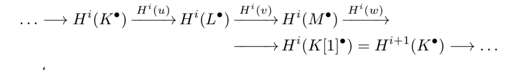 设 $K^\bullet \xrightarrow{u} L^\bullet \xrightarrow{v} M^\bullet \xrightarrow{w} K[1]^\bullet$ 是 $K(\calA)$ 里的好三角,那么以下序列