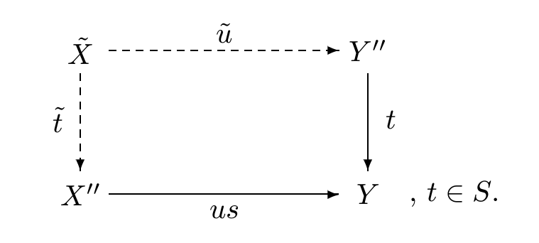 又因为我们在 $\calD_S$ 中有交换 $u’f = gu$, 所以我们有 $$u’\tilde{f} s^{-1} = \tilde{g} t^{-1}u =\tilde{g} \tilde{u}(s \tilde{t})^{-1}$$